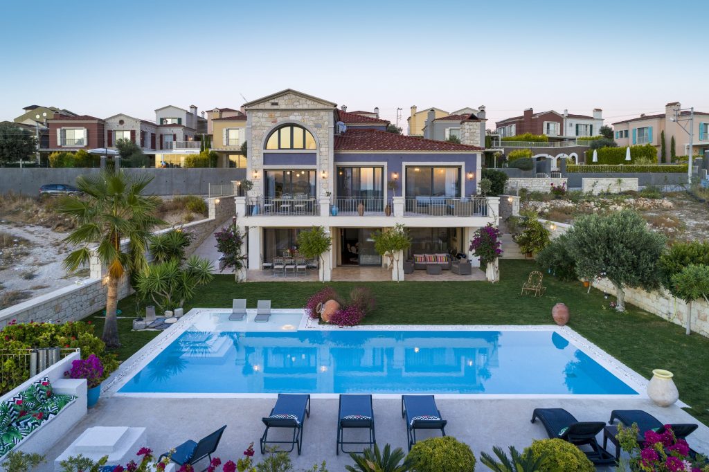 Villa Sunset in Çeşme Ovacık offers a stunning view, situated on a total area of 800 square meters of natural authentic stone villa. It features 7 bedrooms, each with its own ensuite bathroom, 1 separate bathroom, two separate living rooms with an integrated living space and an American-style kitchen, a 60 square meter private swimming pool, sunbathing area, approximately 300 square meters of private landscaped green area, front and back gardens, and a large terrace of 84 square meters on the upper floor. The villa stands out with its fireplaces in each living room and its architecture reflecting French spirit. Designed with underfloor heating, high ceilings, and specially designed living spaces, Villa Sunset is tailored for large families seeking high comfort for their summer vacations and holidays with extensive gatherings in mind.