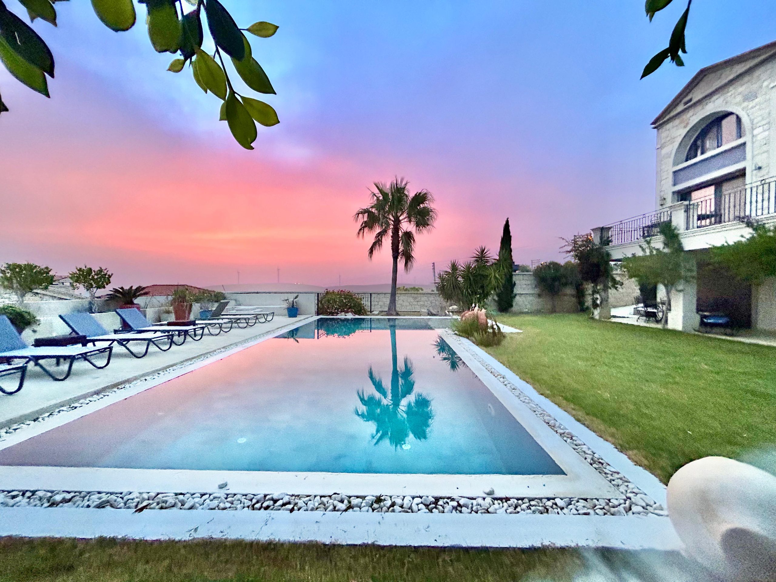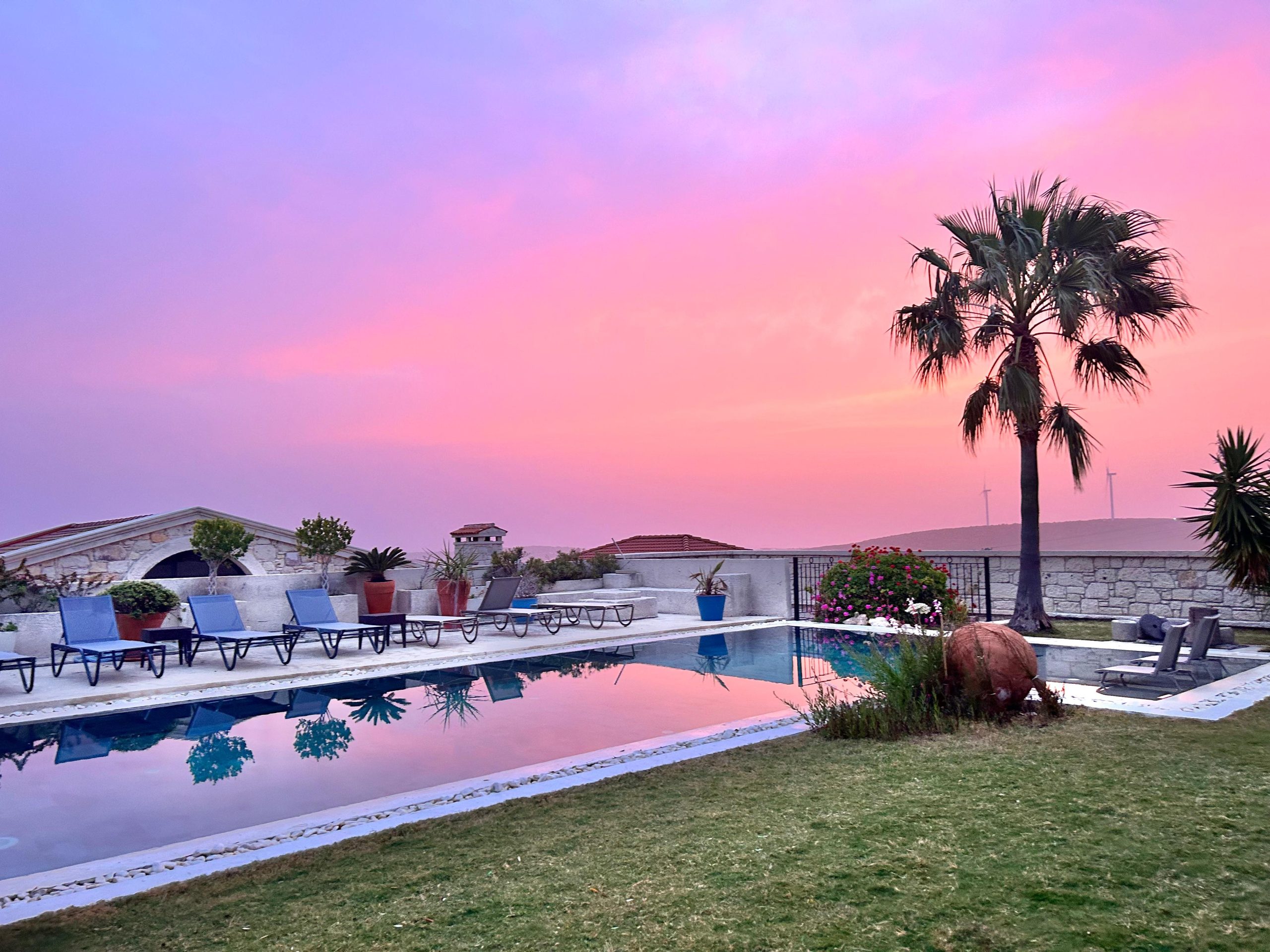 Villa Sunset in Çeşme Ovacık offers a stunning view, situated on a total area of 800 square meters of natural authentic stone villa. It features 7 bedrooms, each with its own ensuite bathroom, 1 separate bathroom, two separate living rooms with an integrated living space and an American-style kitchen, a 60 square meter private swimming pool, sunbathing area, approximately 300 square meters of private landscaped green area, front and back gardens, and a large terrace of 84 square meters on the upper floor. The villa stands out with its fireplaces in each living room and its architecture reflecting French spirit. Designed with underfloor heating, high ceilings, and specially designed living spaces, Villa Sunset is tailored for large families seeking high comfort for their summer vacations and holidays with extensive gatherings in mind.