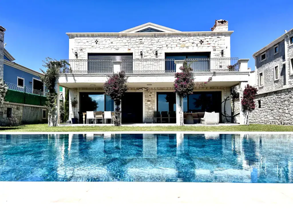 Villa Sunset in Çeşme Ovacık offers a stunning view, situated on a total of 800 square meters of natural authentic stone villa land. It features 7 bedrooms, each with en-suite bathrooms, 1 additional bathroom, two separate lounges with open-plan kitchens, and integrated living spaces. The villa boasts a 60 square meter private swimming pool, sunbathing area, approximately 300 square meters of private landscaped green space, front and rear gardens, and a large terrace of 84 square meters on the upper floor. With fireplaces in each lounge and architecture reflecting a French spirit, Villa Sunset stands out. Designed with underfloor heating, high ceilings, and specially crafted living areas, Villa Sunset caters to the needs of large families seeking high comfort during their summer vacations and holidays.