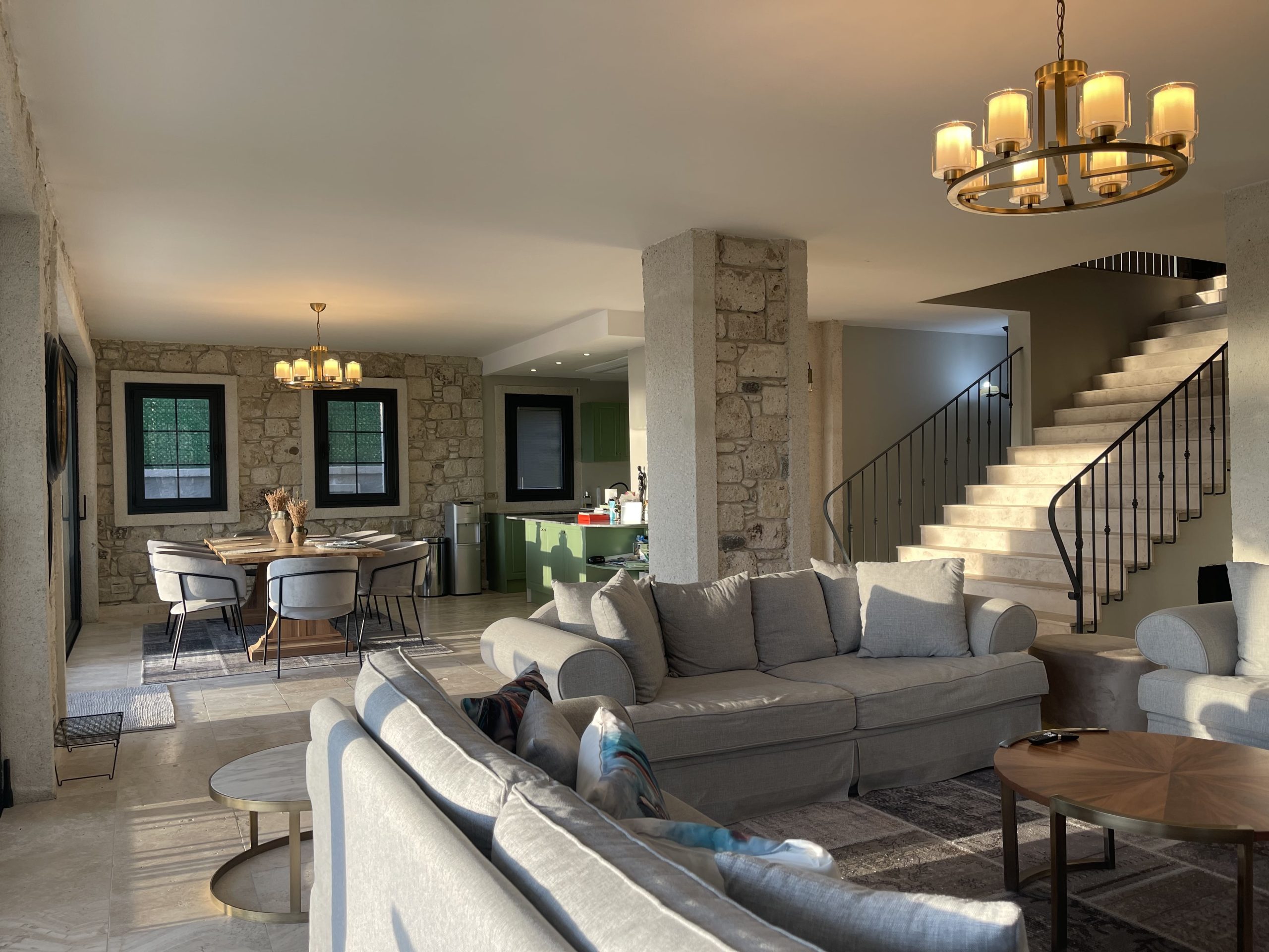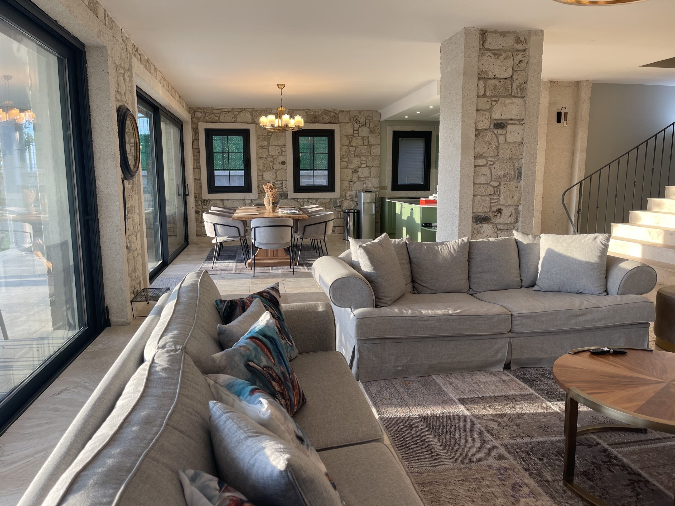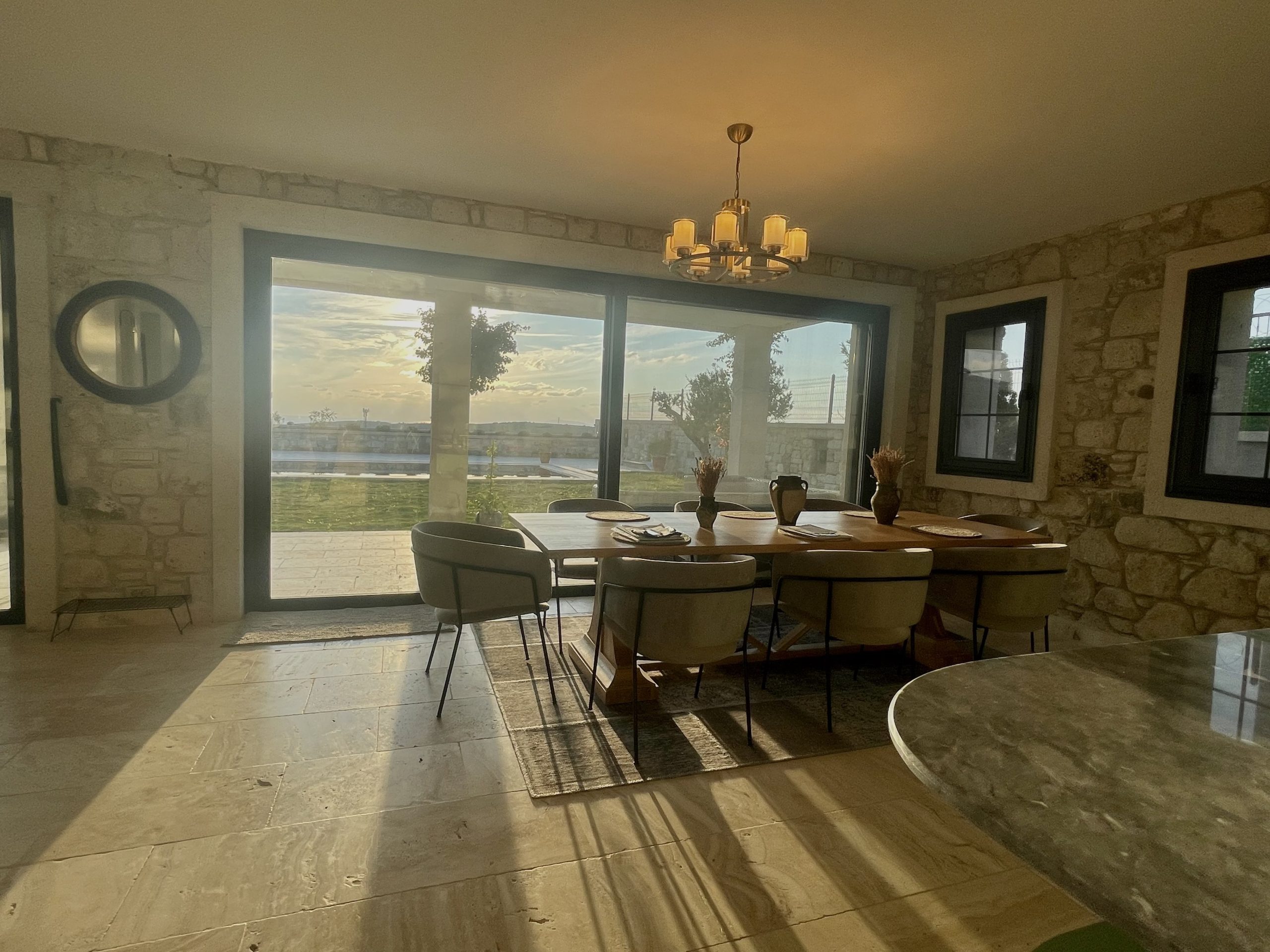 Villa Sunset in Çeşme Ovacık offers a stunning view, situated on a total of 800 square meters of natural authentic stone villa land. It features 7 bedrooms, each with en-suite bathrooms, 1 additional bathroom, two separate lounges with open-plan kitchens, and integrated living spaces. The villa boasts a 60 square meter private swimming pool, sunbathing area, approximately 300 square meters of private landscaped green space, front and rear gardens, and a large terrace of 84 square meters on the upper floor. With fireplaces in each lounge and architecture reflecting a French spirit, Villa Sunset stands out. Designed with underfloor heating, high ceilings, and specially crafted living areas, Villa Sunset caters to the needs of large families seeking high comfort during their summer vacations and holidays.